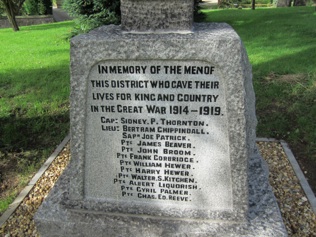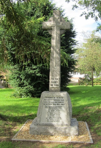 Located in our churchyard is a war memorial. It is a Castle Hill granite wheel cross with a plaque at the bottom of the shaft and further inscription on the smoothed front face of the granite plinth with sloping sides and leaded lettering. The whole memorial is